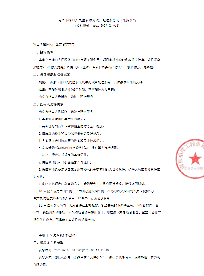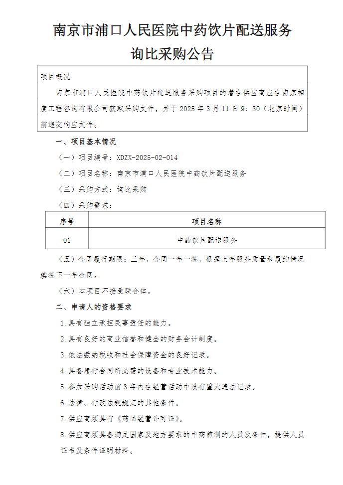 【南京市浦口人民医院】江苏省南京市浦口人民医院中药饮片配送服务询比采购公告