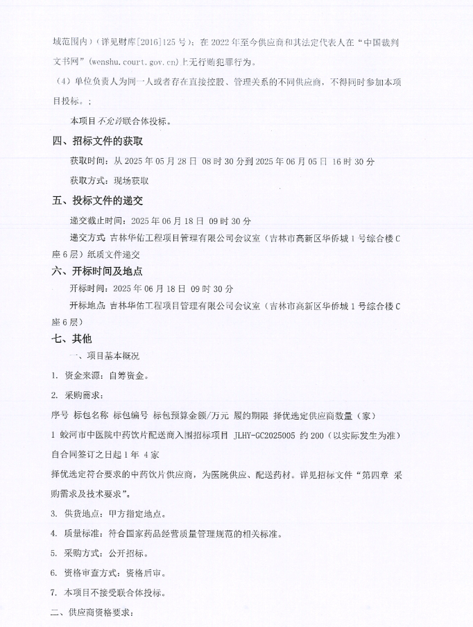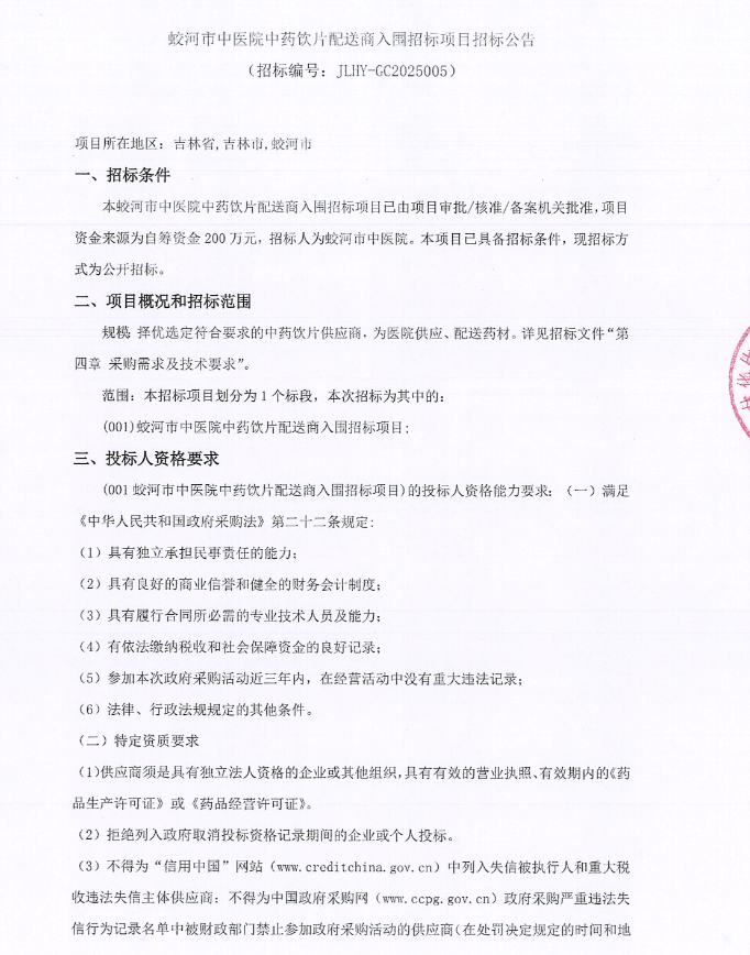 【吉林市蛟河市中医院】吉林省吉林市蛟河市中医院中药饮片配送商入围招标项目招标公告