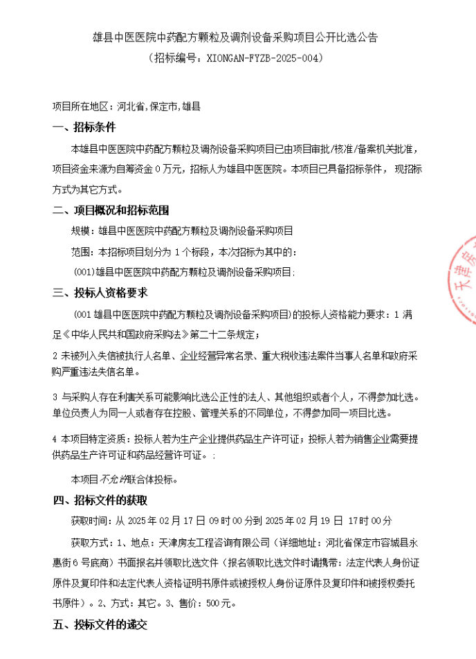 【保定市雄县中医医院】河北省保定市雄县中医医院中药配方颗粒及调剂设备采购项目公开比选公告