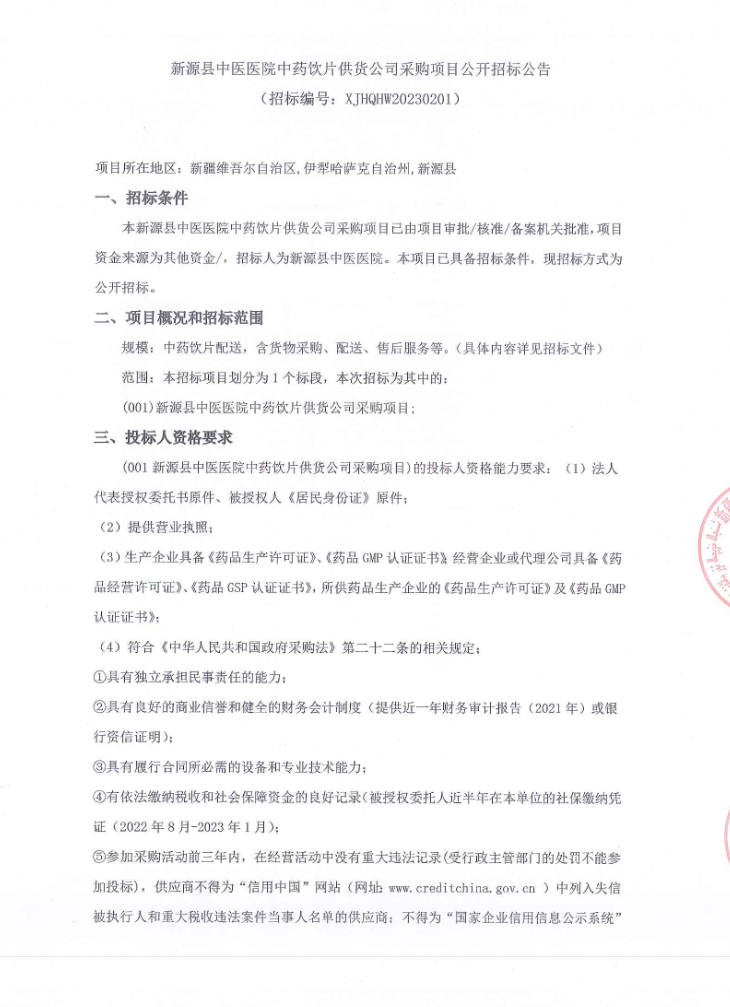 【伊犁哈萨克自治州新源县中医医院】新疆维吾尔自治区伊犁哈萨克自治州新源县新源县中医医院中药饮片供货公司采购项目公开招标公告