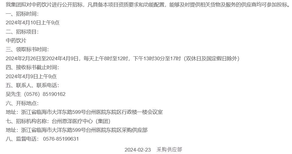 【台州医院】浙江省台州恩泽医疗中心(集团)中药饮片招标公示2024-2-23