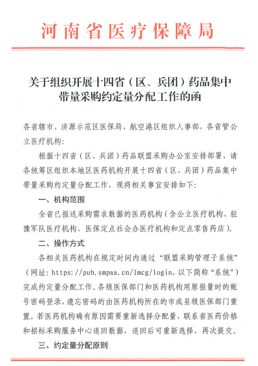 【河南】关于组织开展十四省(区、兵团)药品集中带量采购采购约定量分配工作的函