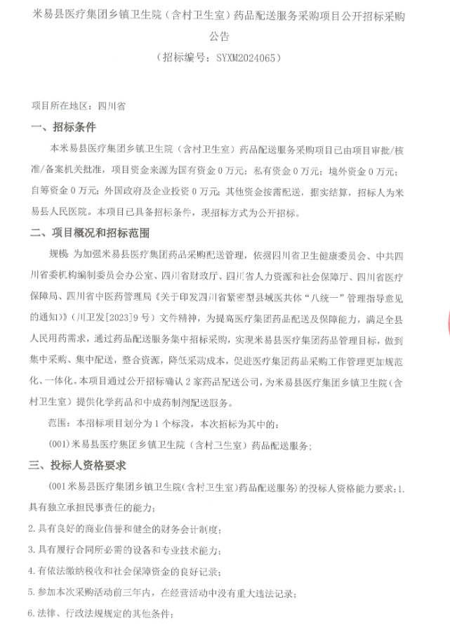 【攀枝花市米易县人民医院】四川省攀枝花市米易县医疗集团乡镇卫生院(含村卫生室)药品配送服务采购项目公开招标采购公告