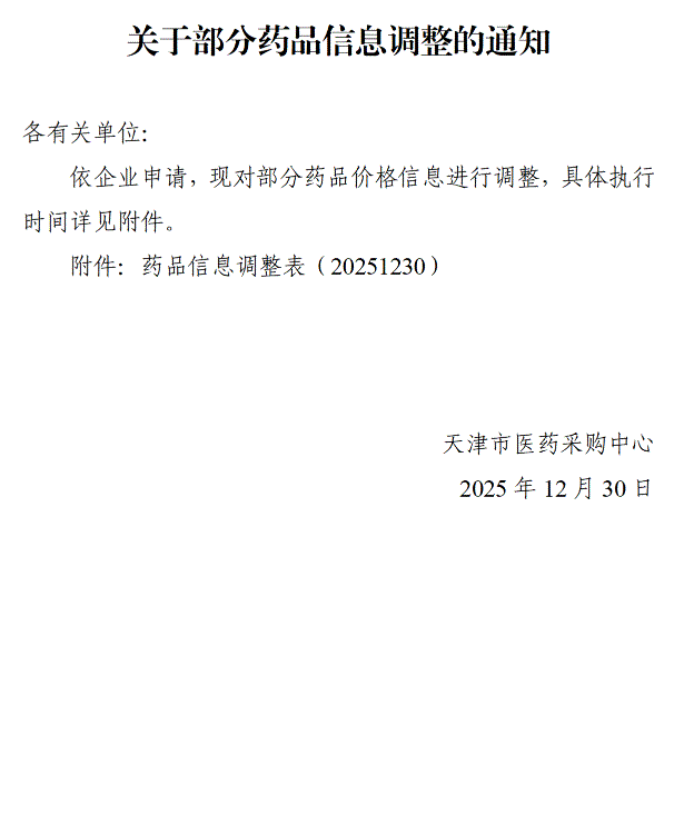 【天津】天津市关于部分药品信息调整的通知(20251230)