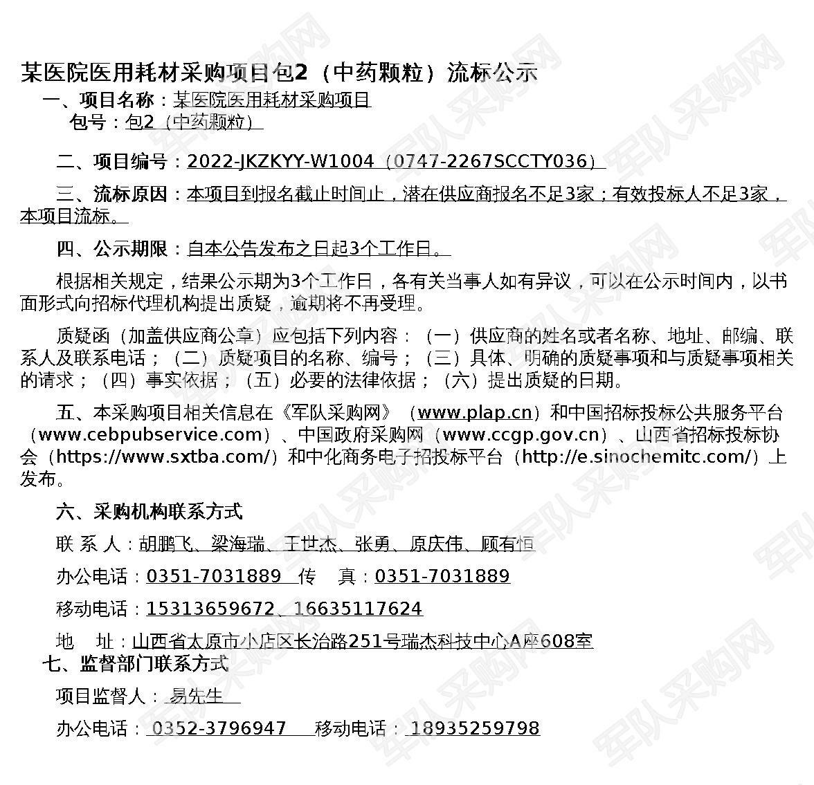 【军队采购网某医院】医用耗材采购项目包2(中药颗粒)流标公示2022-JKZKYY-W1004