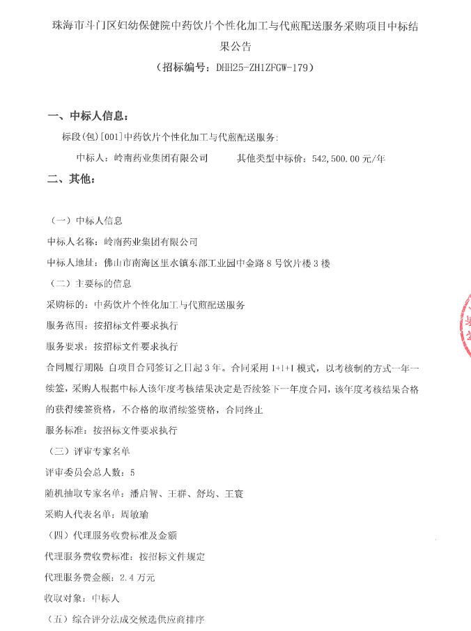 【珠海市斗门区妇幼保健院】广东省珠海市斗门区妇幼保健院中药饮片个性化加工与代煎配送服务采购项目中标结果公告