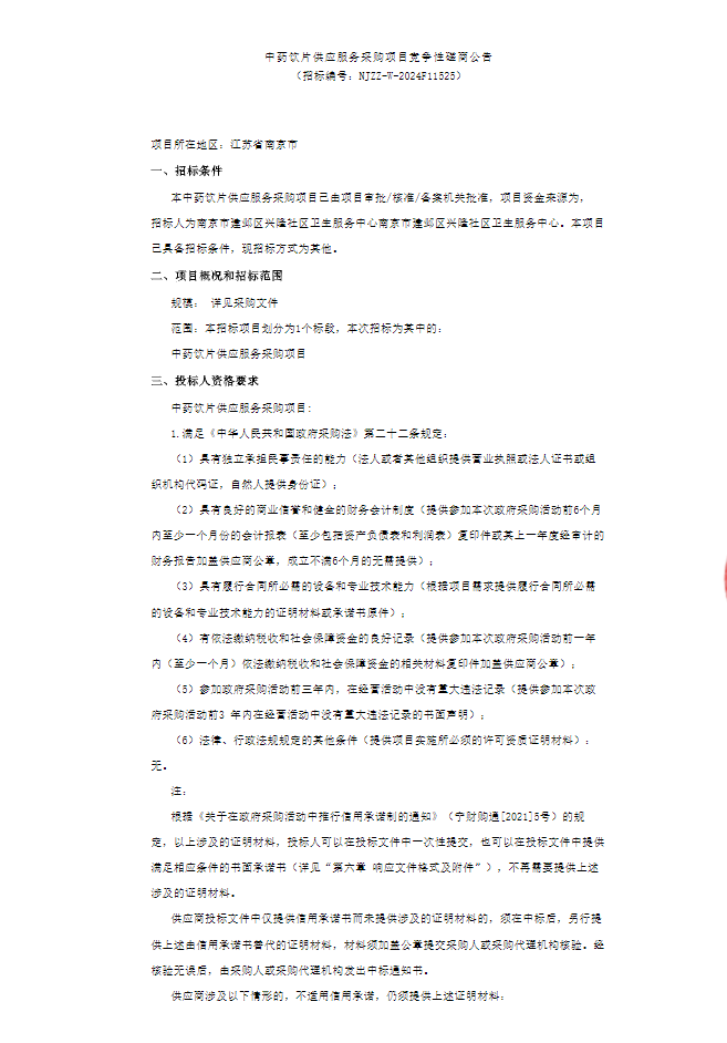 【南京市建邺区兴隆社区卫生服务中心】江苏省南京市建邺区兴隆社区卫生服务中心中药饮片供应服务采购项目竞争性磋商公告