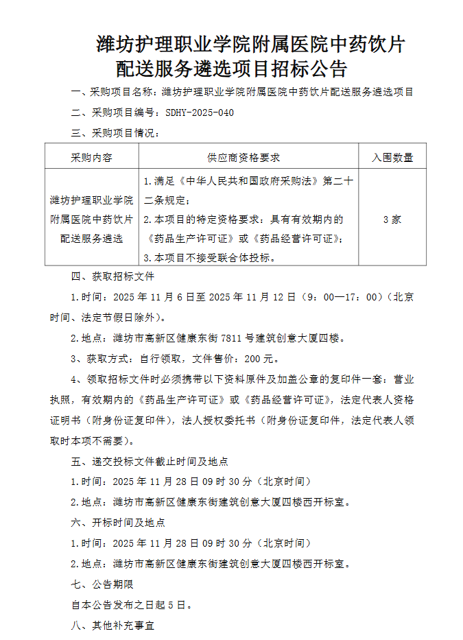 【潍坊护理职业学院附属医院】山东省潍坊护理职业学院附属医院中药饮片配送服务遴选项目招标公告