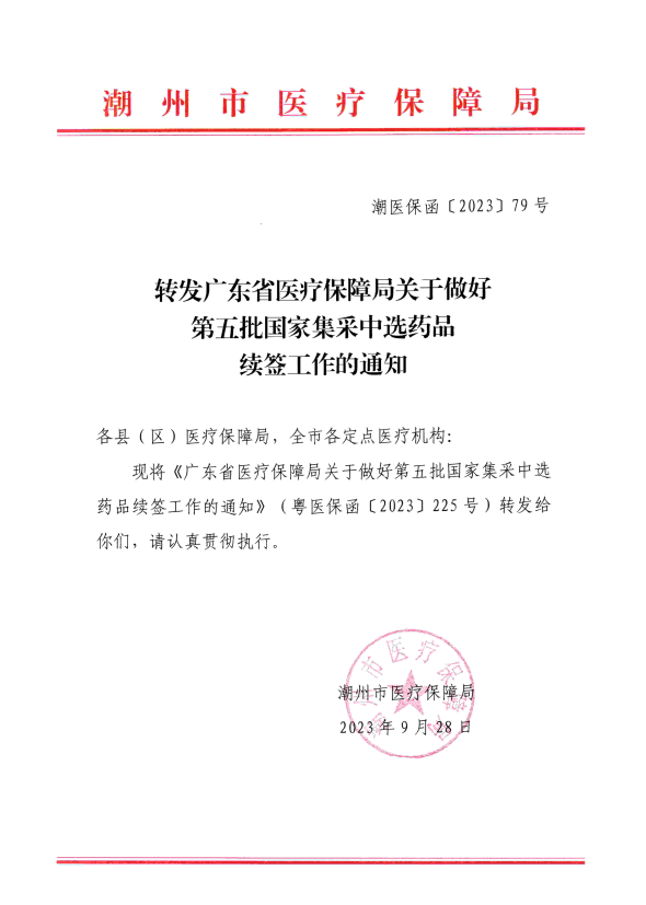 【潮州】广东省潮医保函〔2023〕79号转发广东省医疗保障局关于做好第五批国家集采中选药品续签工作的通知