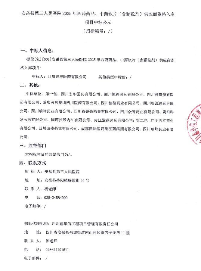 【资阳市安岳县第三人民医院】四川省资阳市安岳县第三人民医院2025年西药药品、中药饮片(含颗粒剂)供应商资格入库项目中标公示