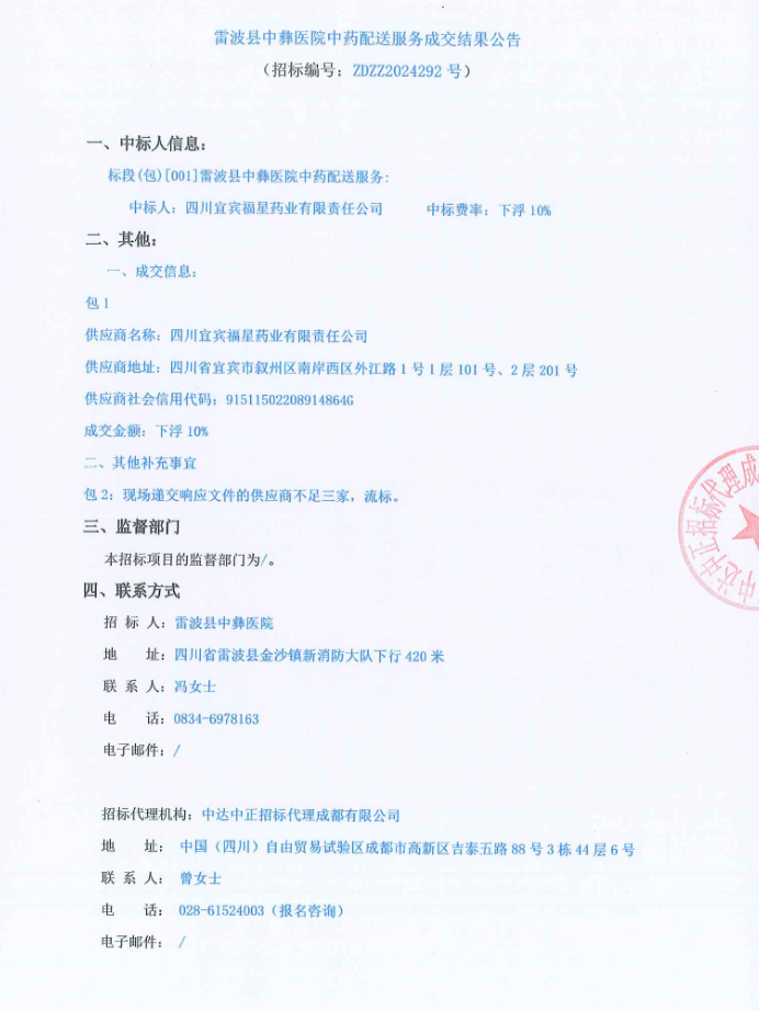 【凉山彝族自治州雷波县中彝医院】四川省凉山彝族自治州雷波县中彝医院中药配送服务成交结果公告