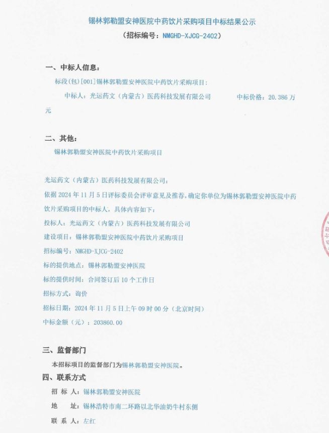 【锡林郭勒盟安神医院】内蒙古自治区锡林郭勒盟安神医院中药饮片采购项目中标结果公示