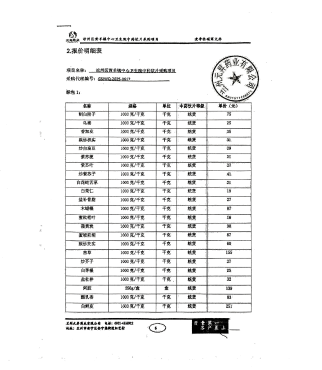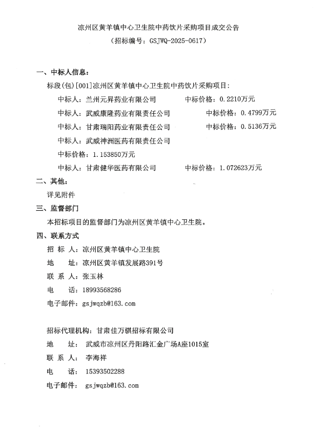 【武威市凉州区黄羊镇中心卫生院】甘肃省武威市凉州区黄羊镇中心卫生院中药饮片采购项目成交公告