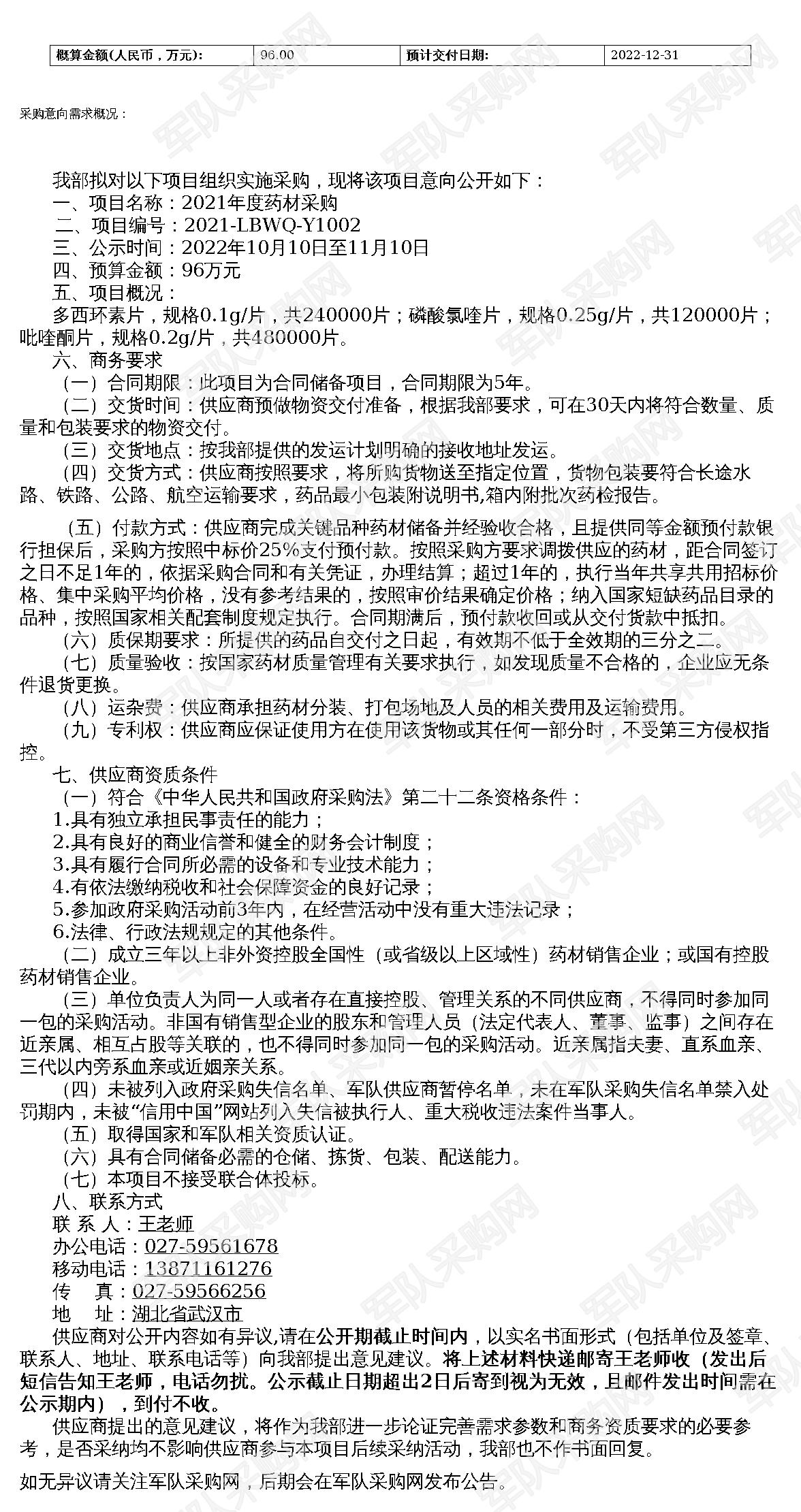 【军队采购网】2021年度药材采购(2021-LBWQ-Y1002)意向公开