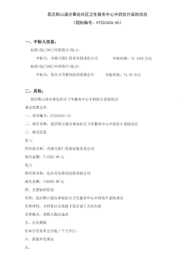 【包头市昆区鞍山道办事处社区卫生服务中心】内蒙古自治区包头市昆区鞍山道办事处社区卫生服务中心中药饮片采购项目