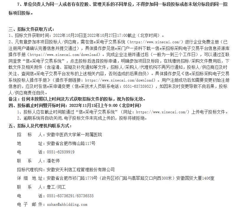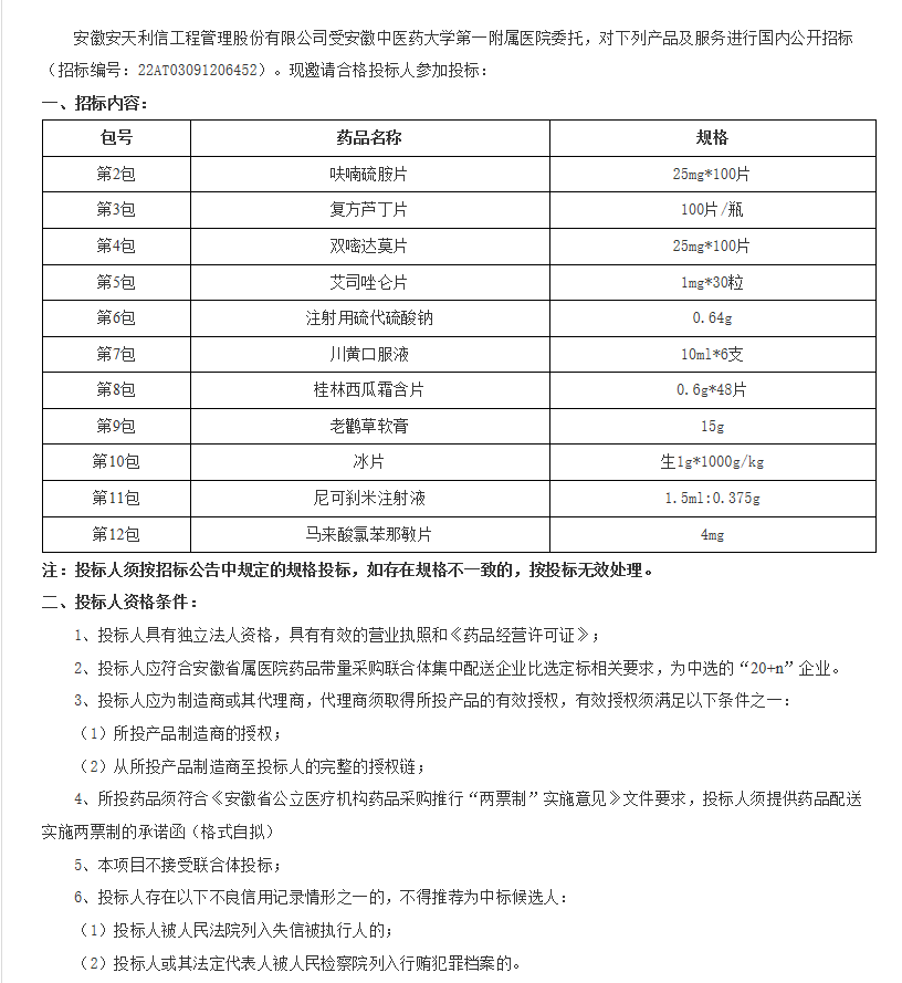 【安徽中医药大学第一附属医院】采购2022年部分药品(第一批)(二次)招标公告(20221020)