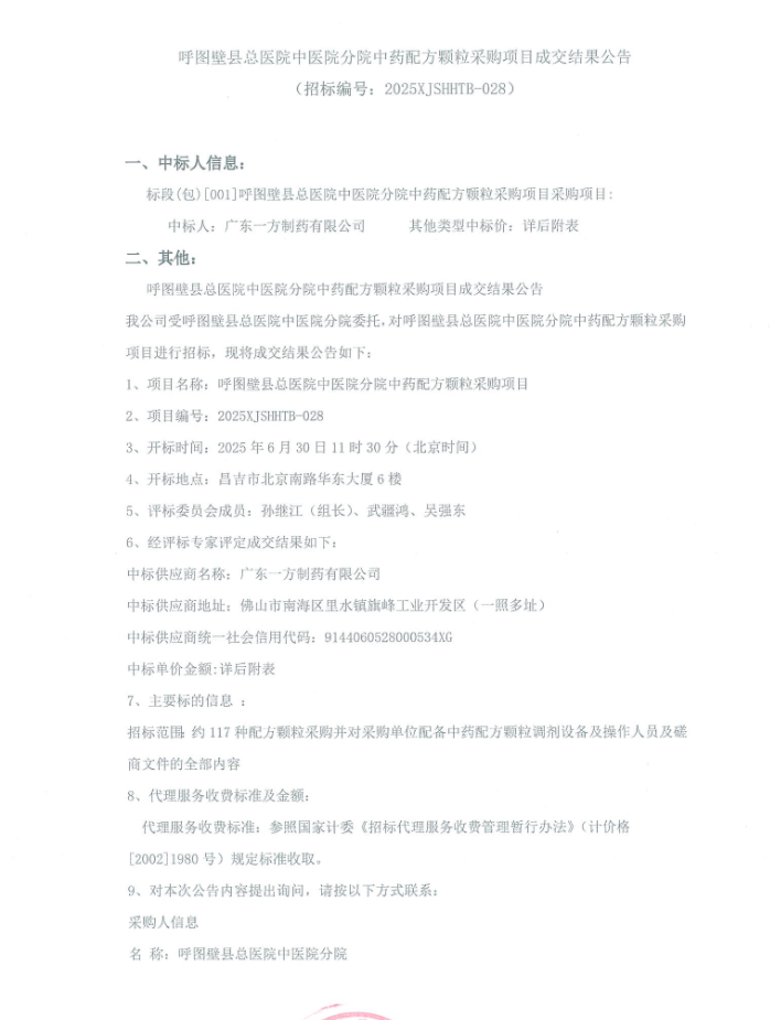【昌吉回族自治州呼图壁县总医院】新疆维吾尔自治区昌吉回族自治州呼图壁县总医院中医院分院中药配方颗粒采购项目成交结果公告