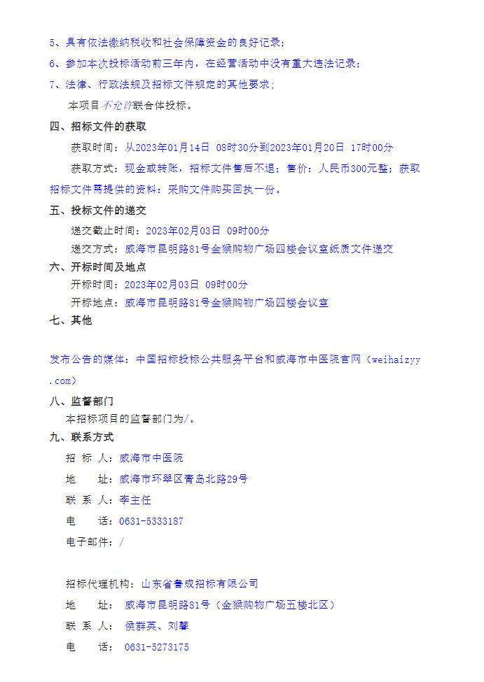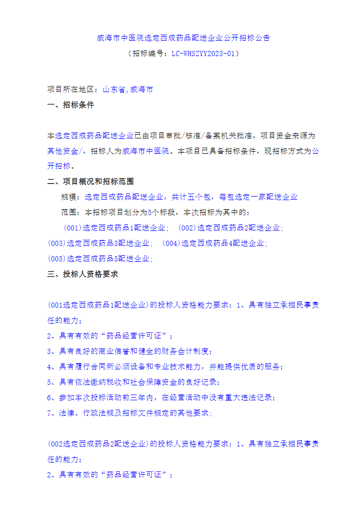 【威海市中医院】山东省威海市中医院选定西成药品配送企业公开招标公告