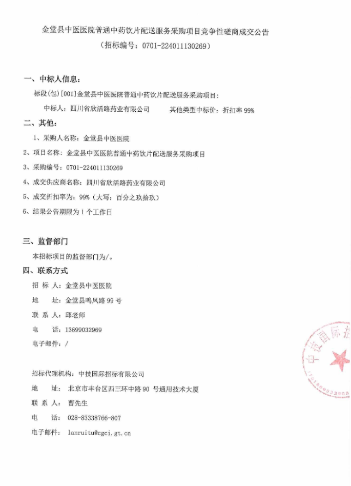 【四川省成都市金堂县中医医院】普通中药饮片配送服务采购项目竞争性磋商成交公告