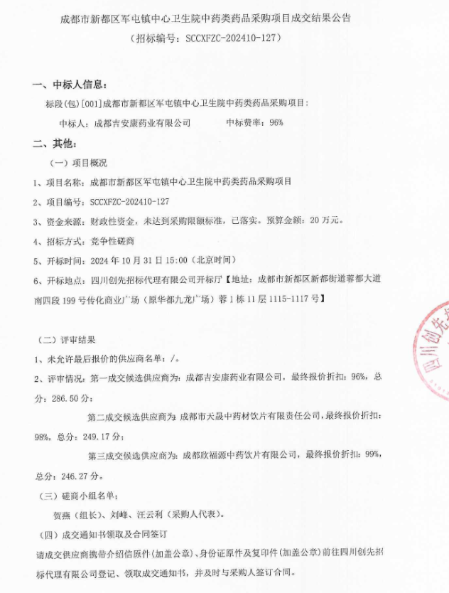 【成都市新都区军屯镇中心卫生院】四川省成都市新都区军屯镇中心卫生院中药类药品采购项目成交结果公告