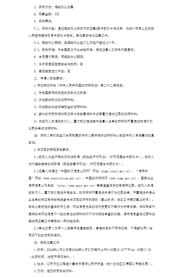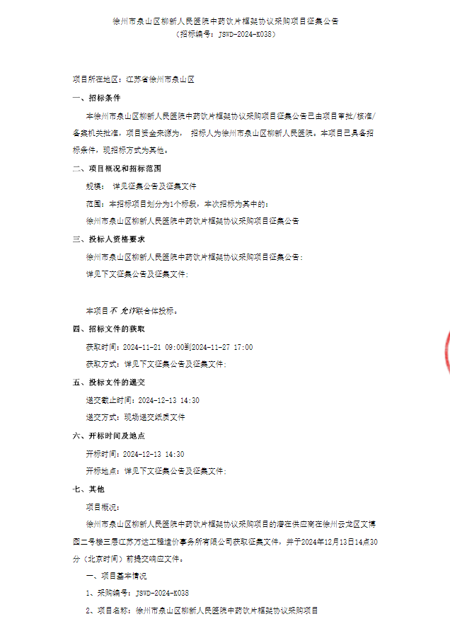 【徐州市泉山区柳新人民医院】江苏省徐州市泉山区柳新人民医院中药饮片框架协议采购项目征集公告