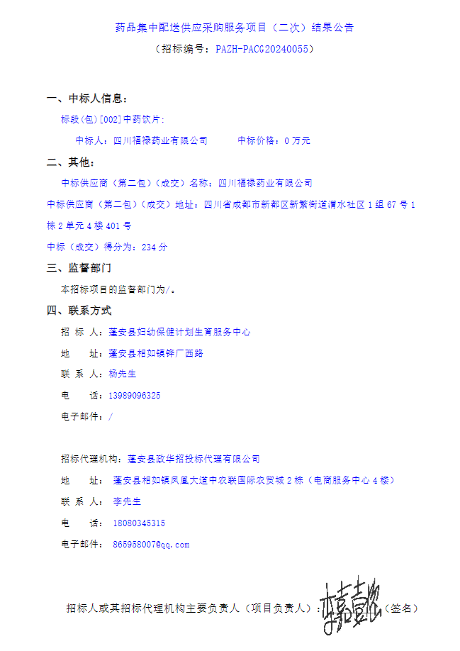 【南充市蓬安县妇幼保健计划生育服务中心】四川省南充市蓬安县妇幼保健计划生育服务中心药品集中配送供应采购服务项目(二次)结果公告
