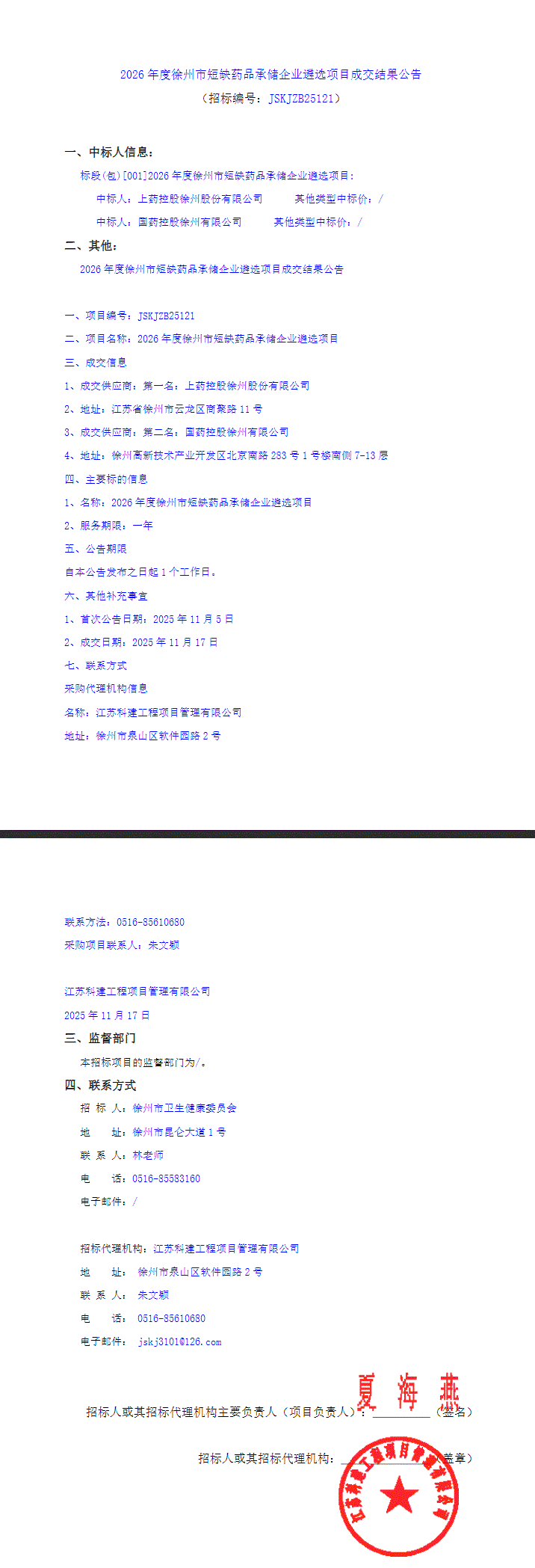 【徐州市卫生健康委员会】江苏省2026年度徐州市短缺药品承储企业遴选项目成交结果公告