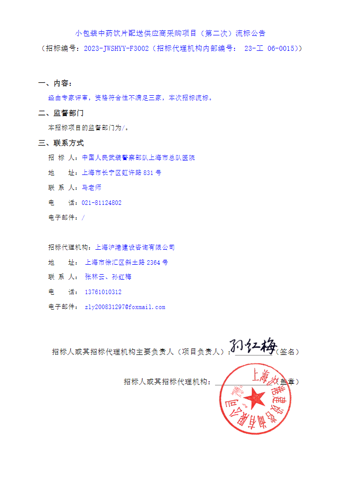 【中国人民武装警察部队上海市总队医院】上海市长宁区中国人民武装警察部队上海市总队医院小包装中药饮片配送供应商采购项目(第二次)流标公告