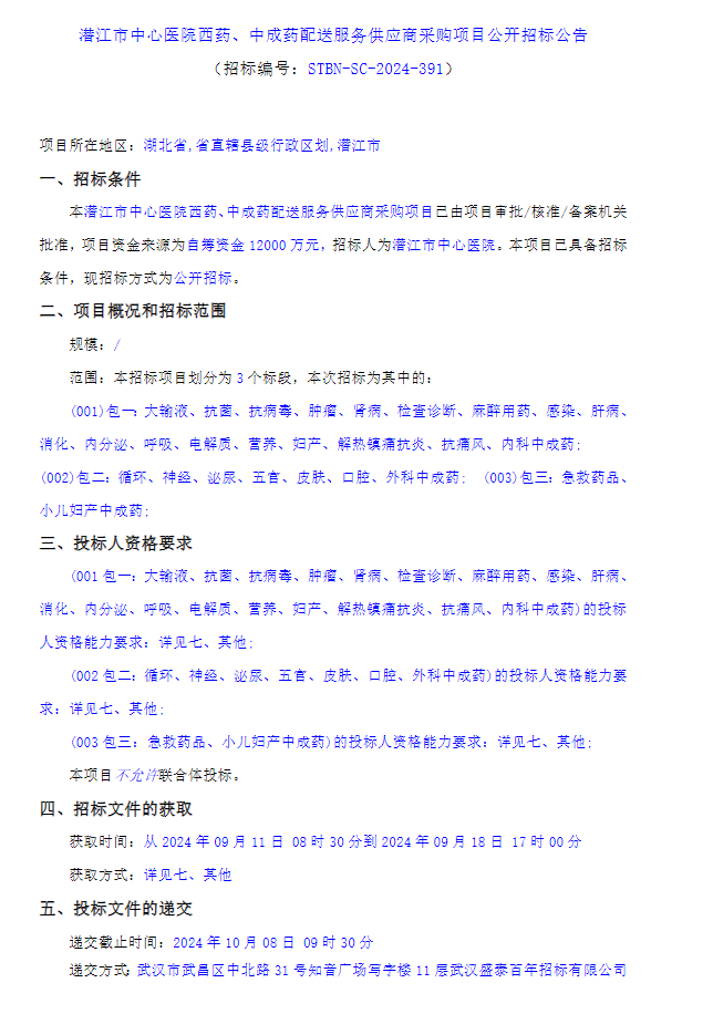 【潜江市中心医院】湖北省潜江市中心医院西药、中成药配送服务供应商采购项目公开招标公告