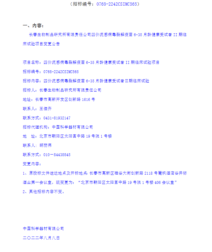 【长春生物制品研究所有限责任公司】长春生物制品研究所有限责任公司四价流感病毒裂解疫苗6-35月龄健康受试者II期临床试验变更公告