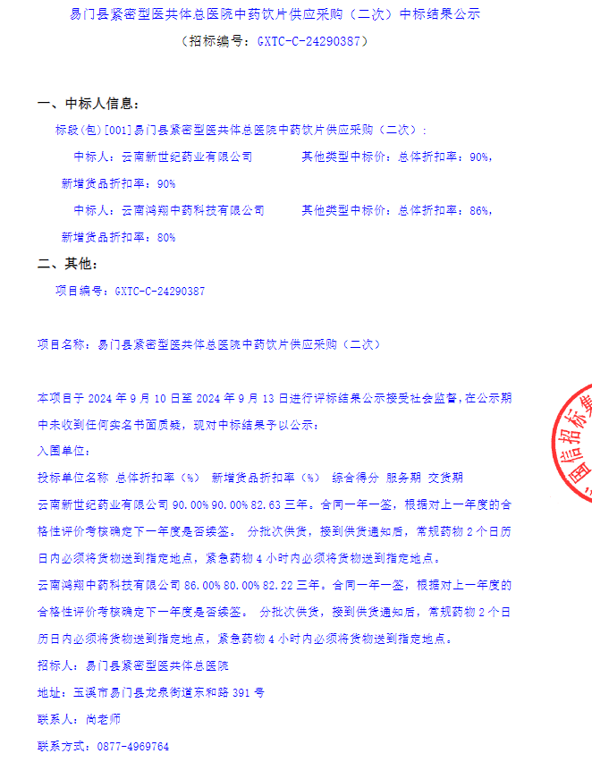 【玉溪市易门县紧密型医共体总医院】云南省玉溪市易门县紧密型医共体总医院中药饮片供应采购(二次)中标结果公示