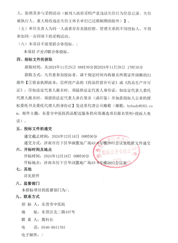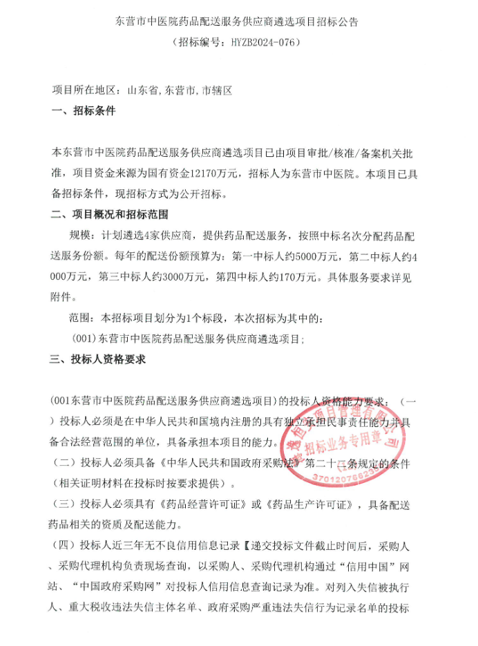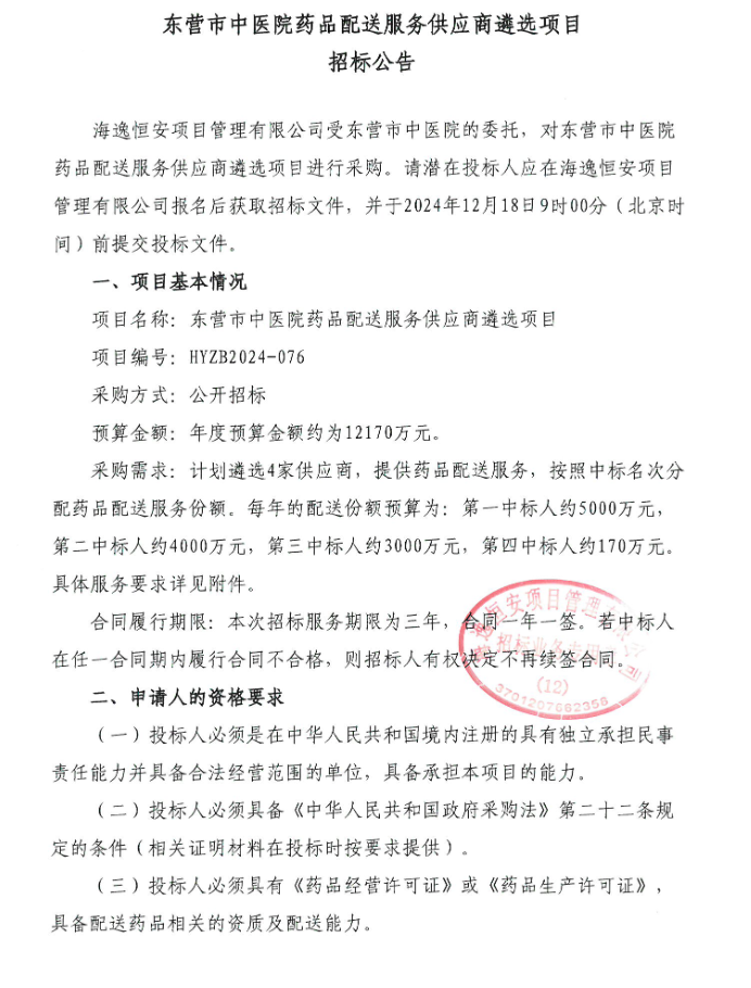 【东营市中医院】山东省东营市中医院药品配送服务供应商遴选项目招标公告