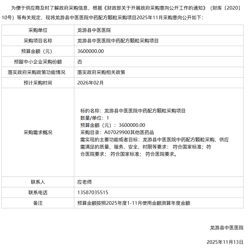 【衢州市龙游县中医医院】浙江省衢州市龙游县中医医院中药配方颗粒采购项目2025年11月政府采购意向