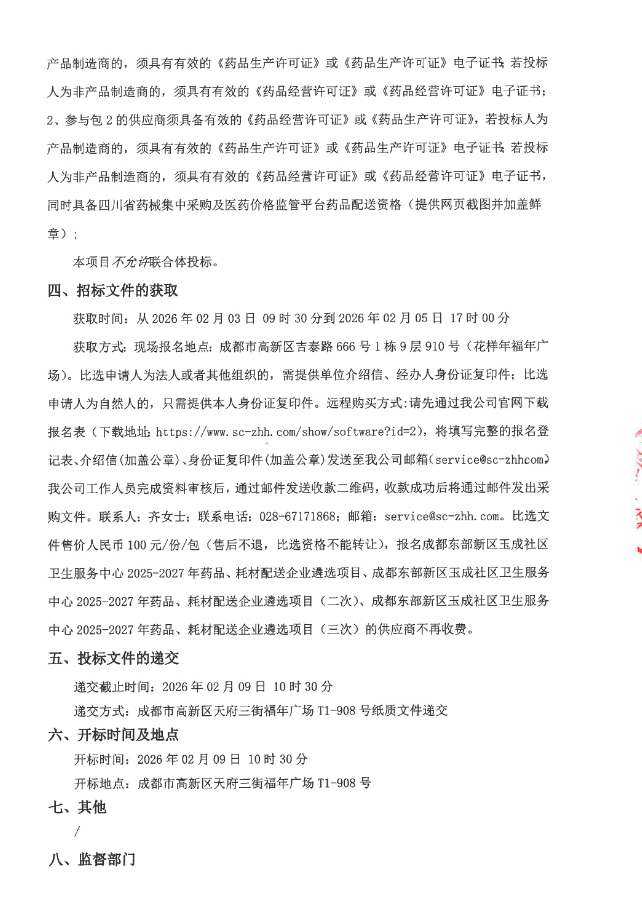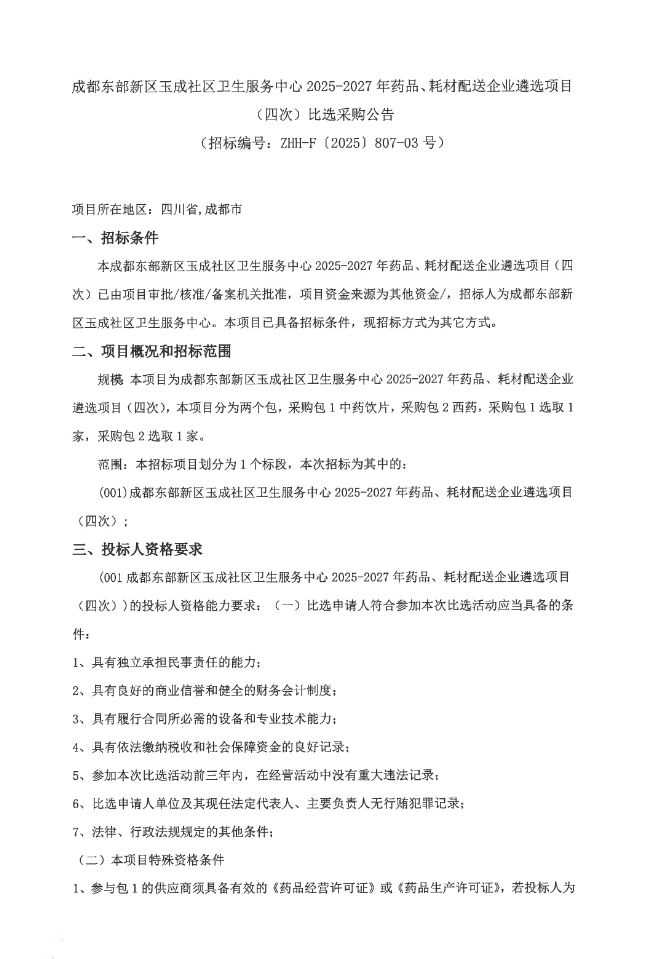 【成都东部新区玉成社区卫生服务中心】四川省成都东部新区玉成社区卫生服务中心2025-2027年药品、耗材配送企业遴选项目(四次)比选采购公告