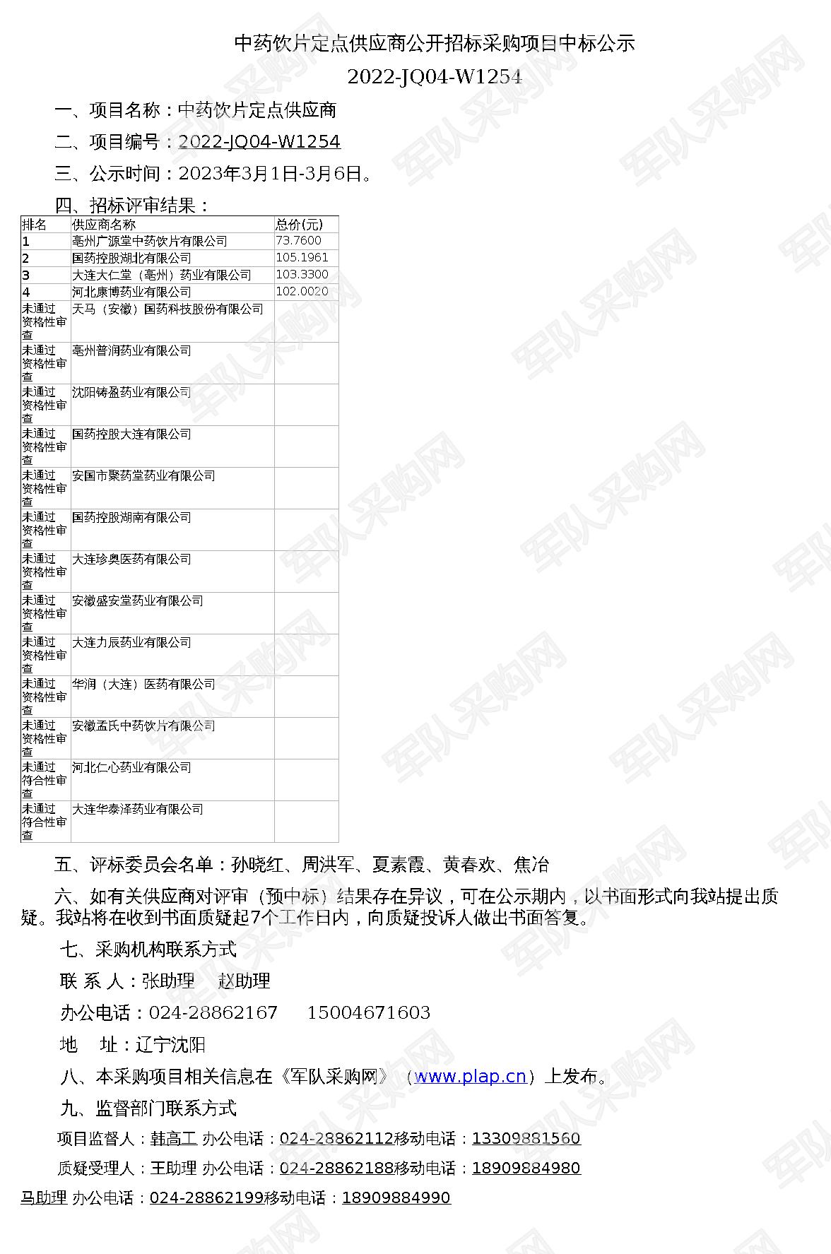 【军队采购】军队采购网中药饮片定点供应商公开招标采购项目中标公示2022-JQ04-W1254