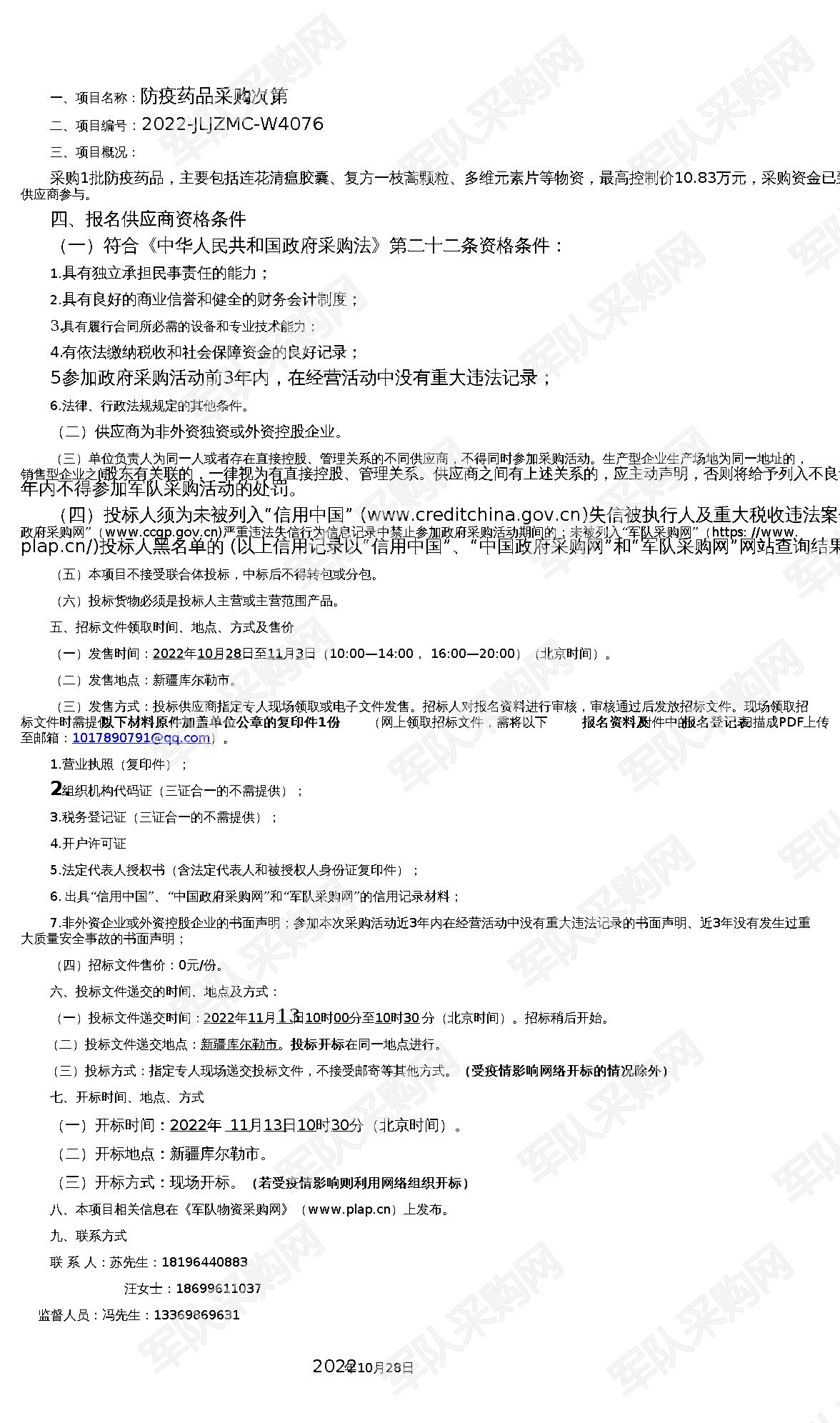 【军队采购网】防疫药品采购(第2次)公告(2022-JLJZMC-W4076)