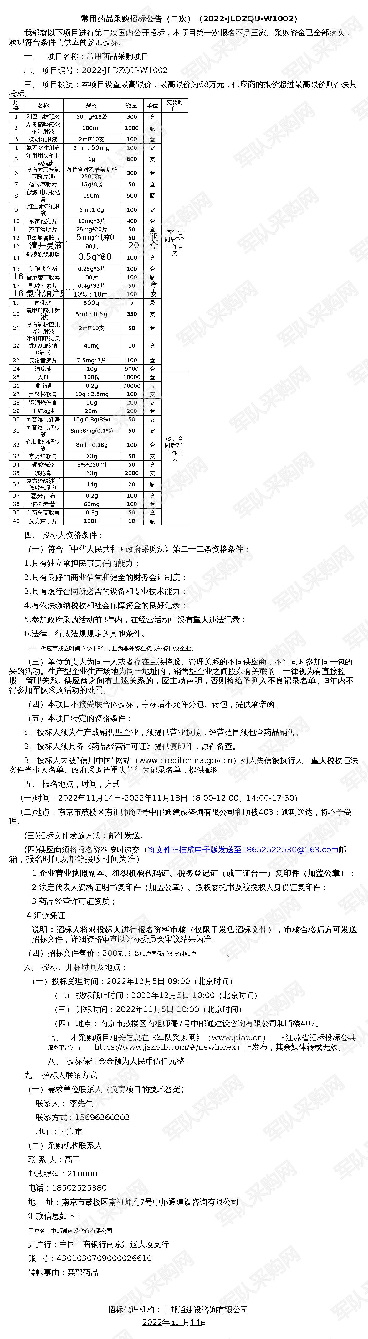 【军队采购】军队采购网常用药品采购招标公告(二次)(2022-JLDZQU-W1002)