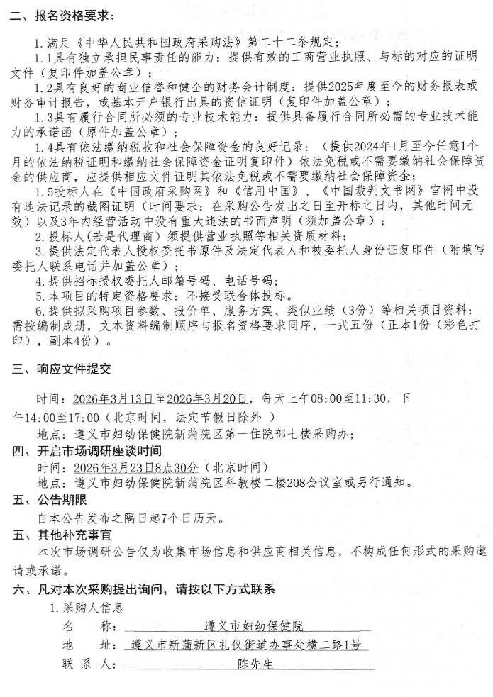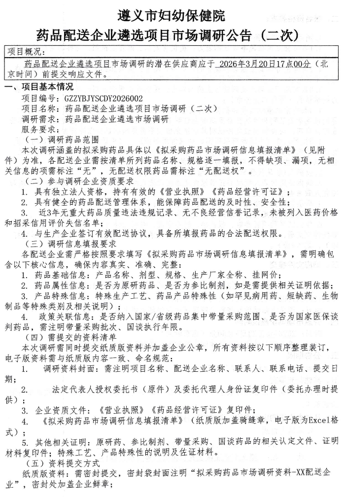 【遵义市妇幼保健院】贵州省遵义市妇幼保健院药品配送企业遴选项目市场调研(二次)