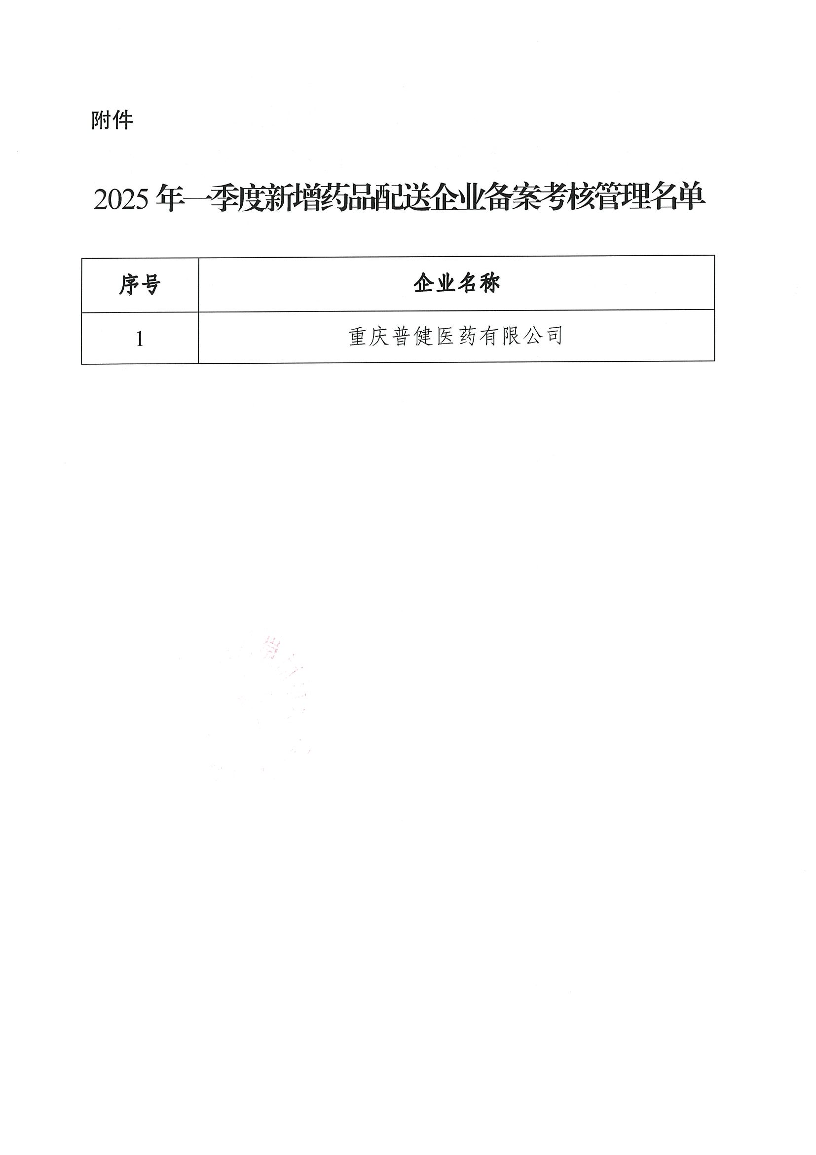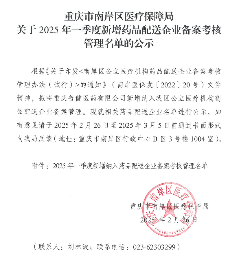根据《关于印发<南岸区公立医疗机构药品配送企业备案考核管理办法(试行)>的通知》(南岸医保发〔2022〕20号)文件精神,拟将重庆普健医药有限公司新增纳入我区公立医疗机构药品配送企业备案管理。现就相关药品配送企业名单进行公示,如有意见请于2025年2月26日至2025年3月5日前通过书面形式向我局反馈(地址:重庆市南岸区行政中心B区3号楼1004室)。