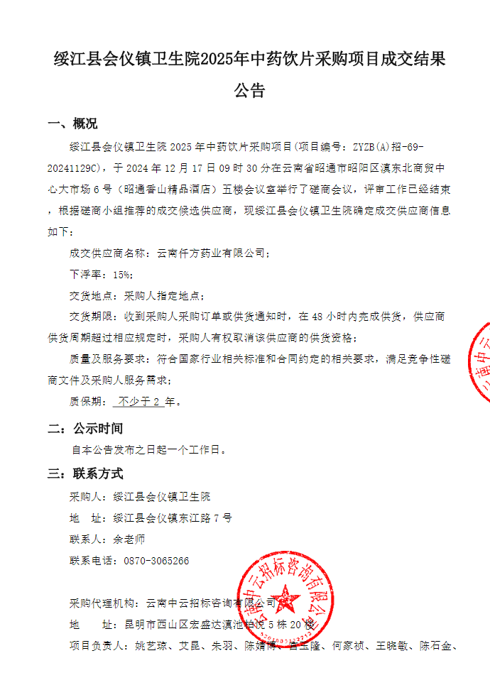 【昭通市绥江县会仪镇卫生院】云南省昭通市绥江县会仪镇卫生院2025年中药饮片采购项目成交结果公告
