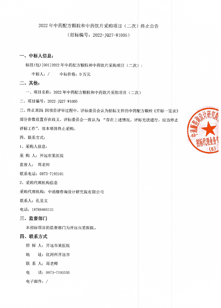 【云南省红河哈尼族彝族自治州开远市某医院】2022年中药配方颗粒和中药饮片采购项目(二次)终止公告