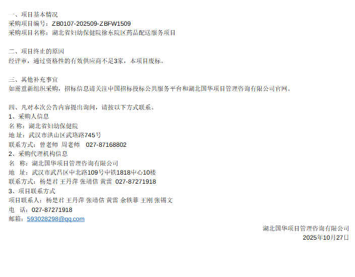 【湖北省妇幼保健院】湖北省妇幼保健院徐东院区药品配送服务项目废标公告