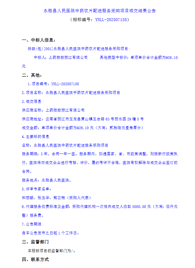 【丽江市永胜县人民医院】云南省丽江市永胜县人民医院中药饮片配送服务采购项目成交结果公告