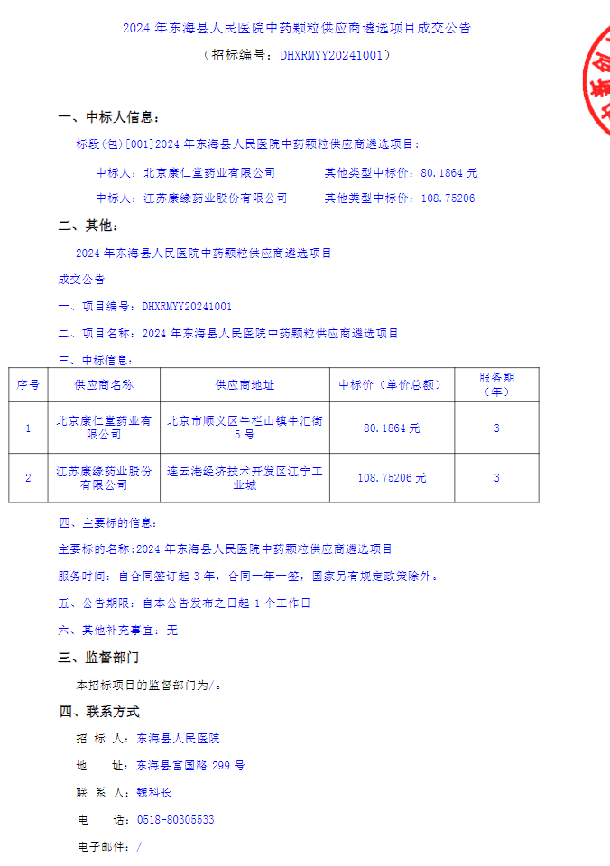 【连云港东海县人民医院】苏省连云港市2024年东海县人民医院中药颗粒供应商遴选项目成交公告