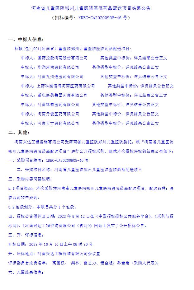 【郑州儿童医院】河南省儿童医院郑州儿童医院医院药品配送项目结果公告