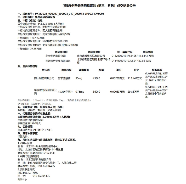 【北京】北京市免费避孕药具采购(第三、五包)成交结果公告