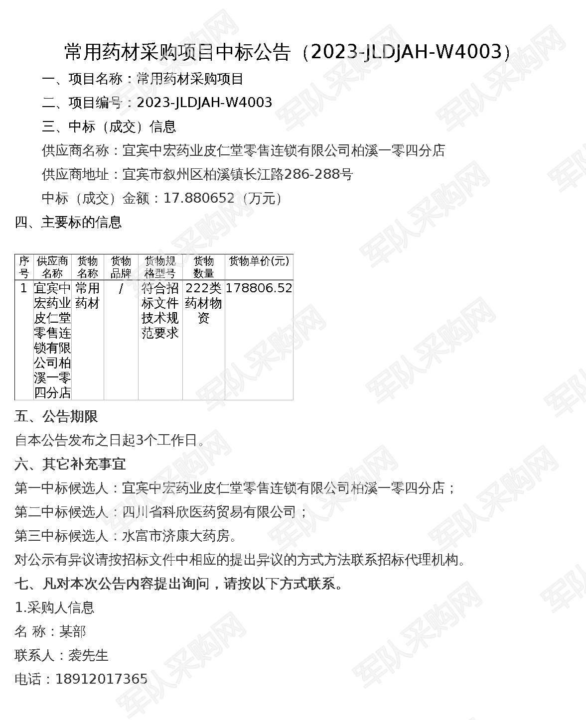【军队采购】军队采购网常用药材采购项目中标公告2023-JLDJAH-W4003