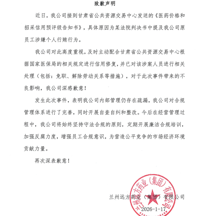 【甘肃】兰州远方药业(集团)有限公司主动纠正失信行为致歉声明