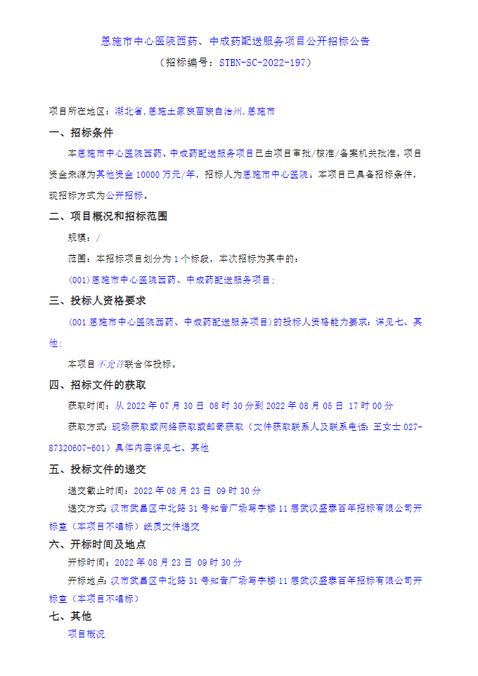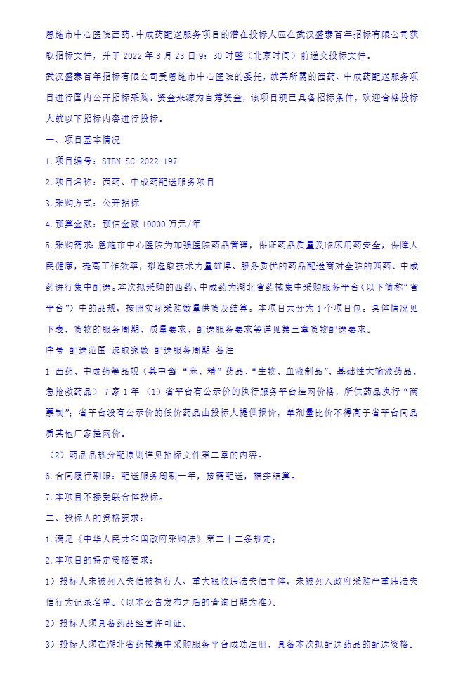 【恩施市中心医院】湖北恩施市中心医院西药、中成药配送服务公开招标公告