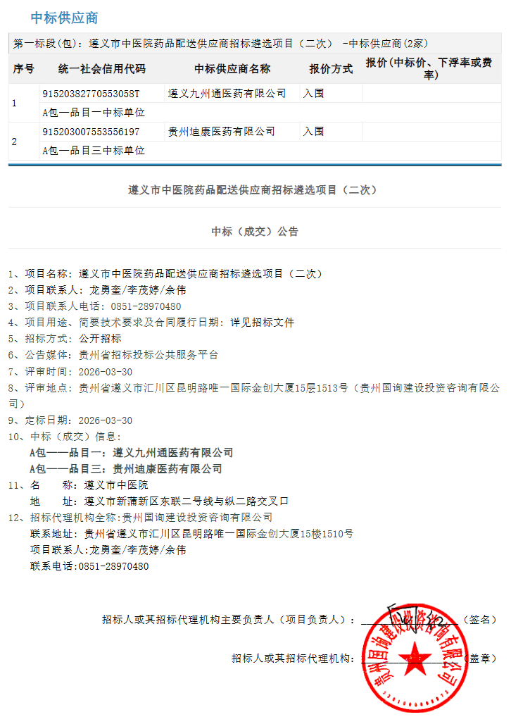 【遵义市中医院】贵州省遵义市中医院药品配送供应商招标遴选项目(二次)中标(成交)公告